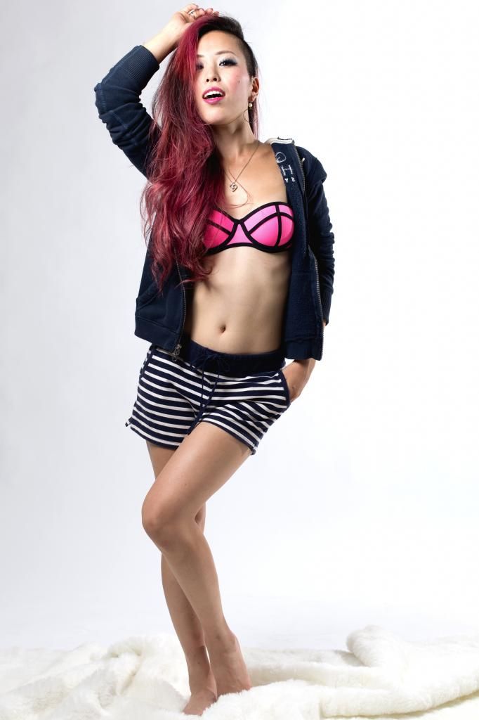 That said, don't you think Eric did an AMAZING job making both me and the underwear look both charming yet seductive?? I played around with it, styling it up in different ways: wearing fake glasses or some little gold jewelry and changing the lip colors... Underwear is cute by itself, but I like it also paired with a hoodie and/or with room wear clothing such as lounge shorts. The bra turned out looking like a cool sporty bra and the neon color stands out vividly!