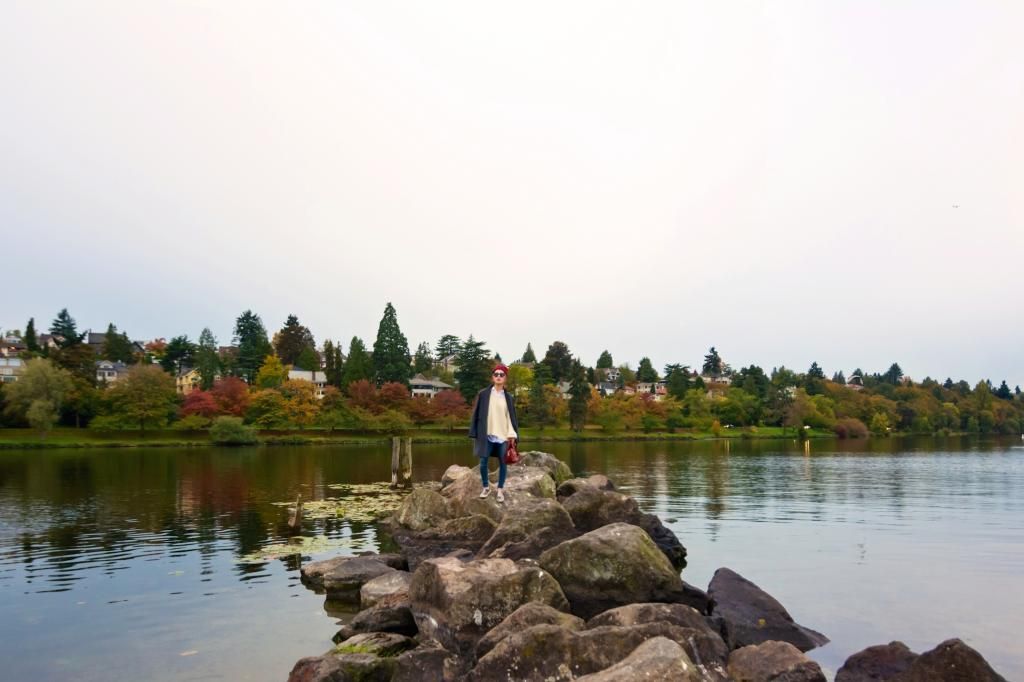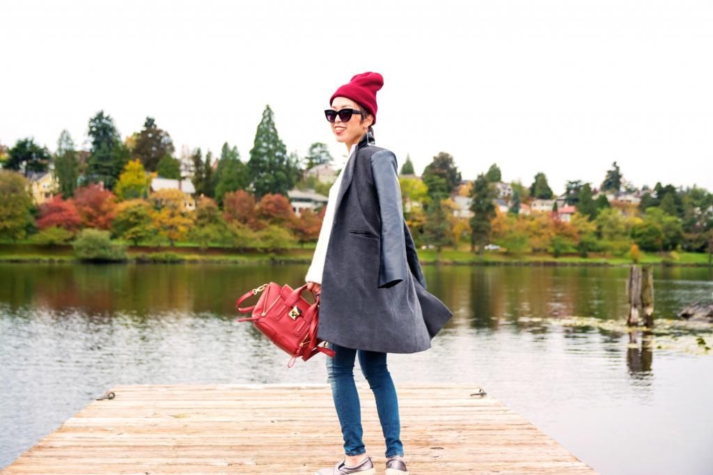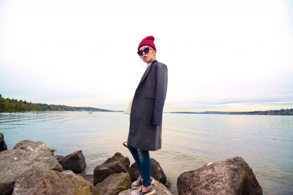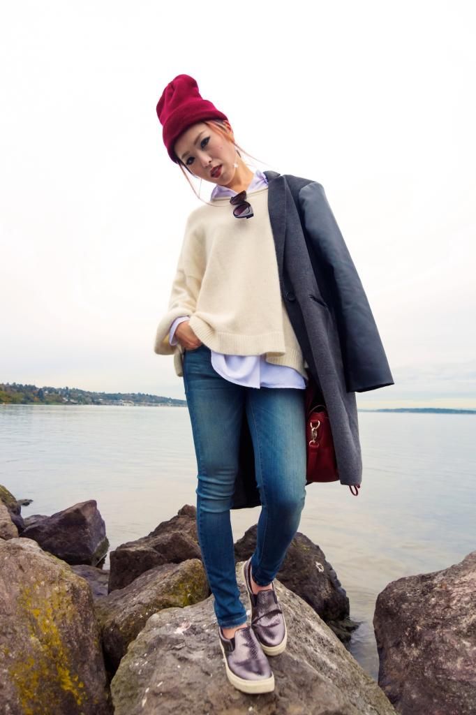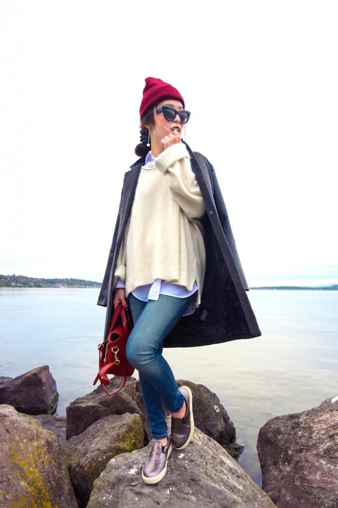 Whenever I wear flat shoes, I always make sure to create an "I" figure or to try to raise the eye sight up by wearing a hat or styling the hair with updo. So I combined with a pair of skinny jeans and a long coat and finished off the look by pairing a beanie. The beanie is red which is great and so bright that I can catch the first sight to the top, not to the bottom part when being seen. It's also all about feeling cozy and snug this season! I love layering up with a shirt and sweater and tossing my coat over the shoulder! It's super effortless yet on-trend!