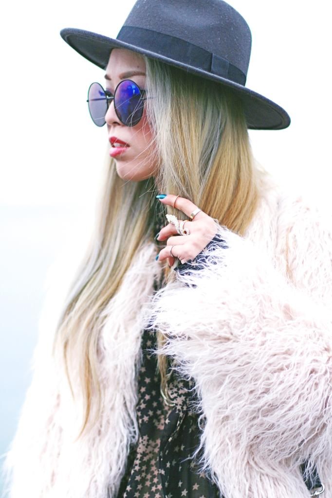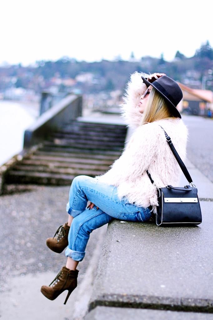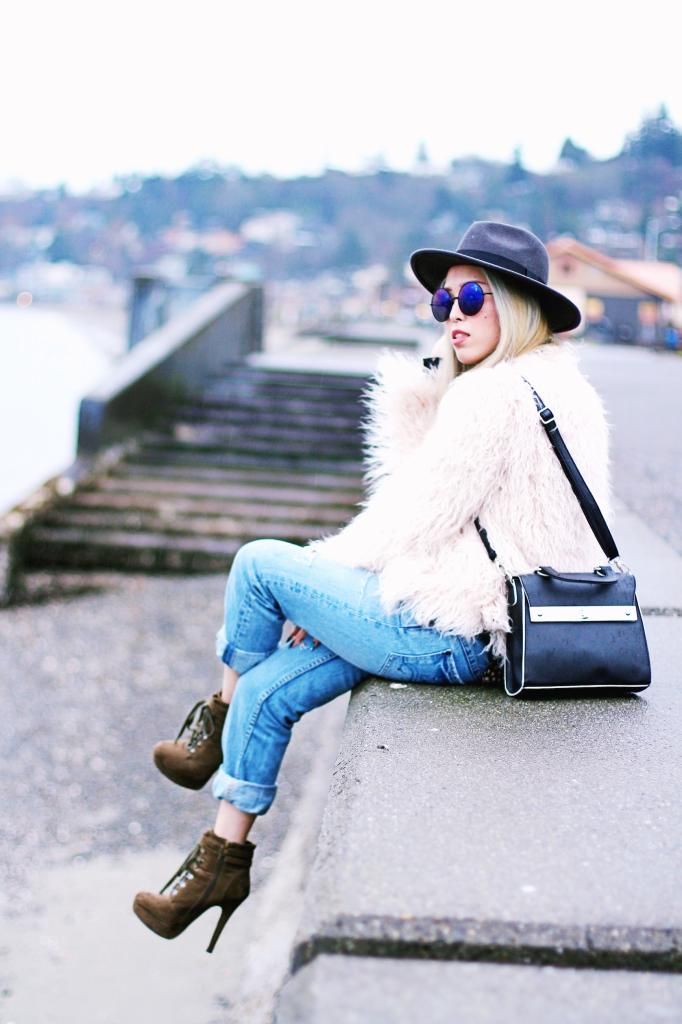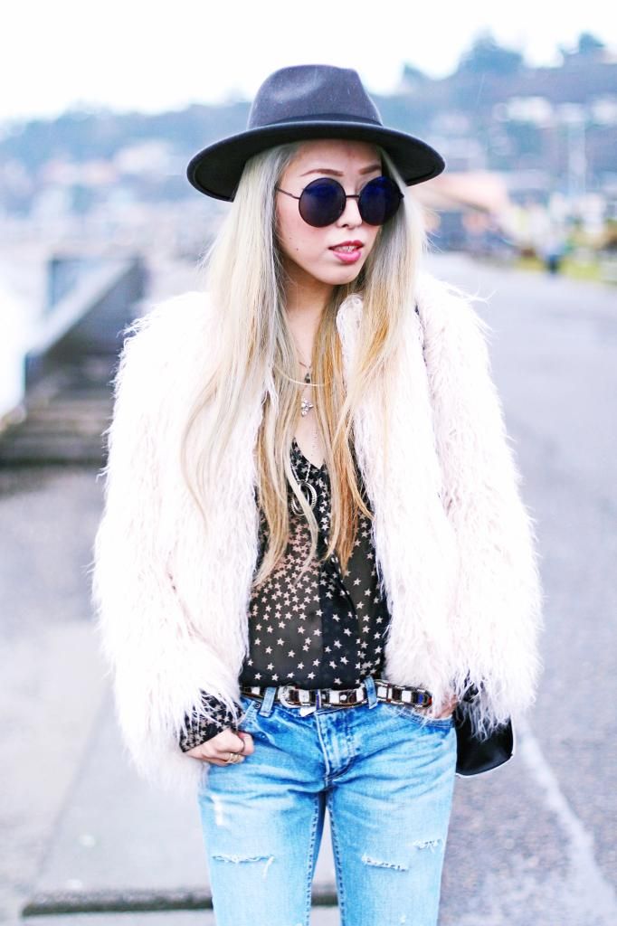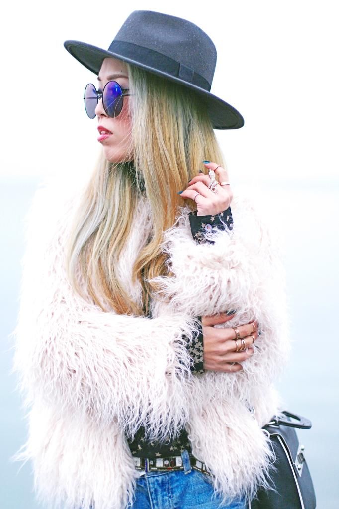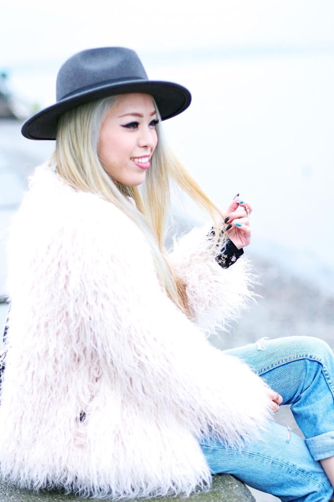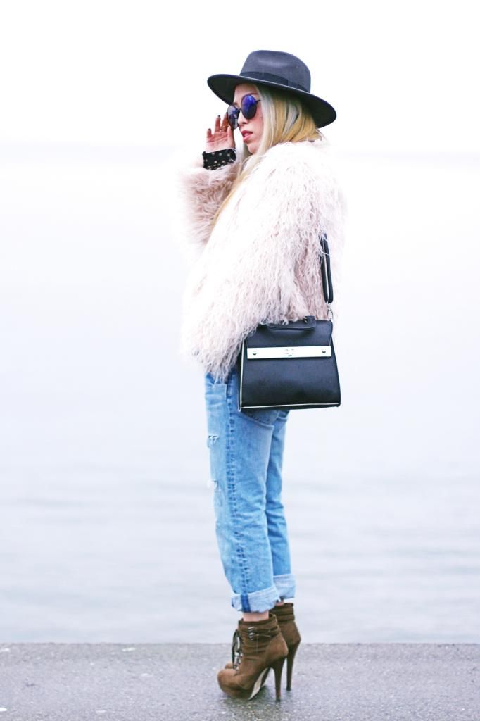 I topped it off in my No.1 beloved faux fur jacket that I scored from Zara this season. I LOVE THIS JACKET to death. Don't think I am saying too much. It's an amazingly perfect jacket! Seriously can't get enough of everything about it. Pink pastel color, awesome fitting, its textures, and how warm it can keep me! My love affair with this number is growing every time I wear it. Even though spring is approaching and the sun is out more often, sadly it's still chilly and I have to bundle up. Whenever I am so lazy to style my hair, I always go for a fedora. It definitely helps me look effortlessly so chic. I wanna make a fashion proverb: "When doubt, go for a fedora. You won't regret it at all." Do you agree?