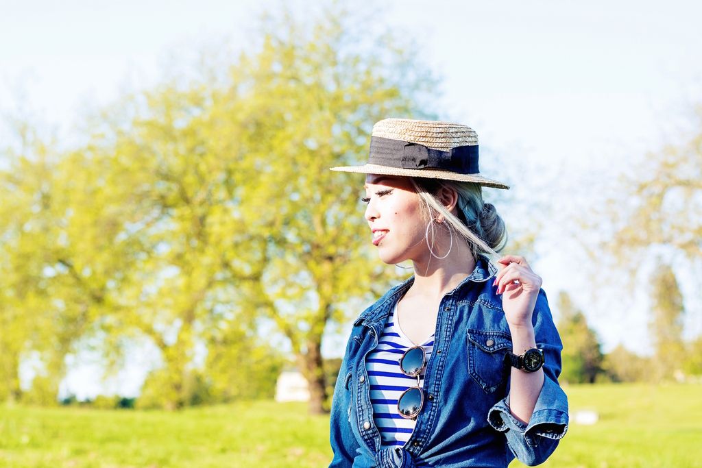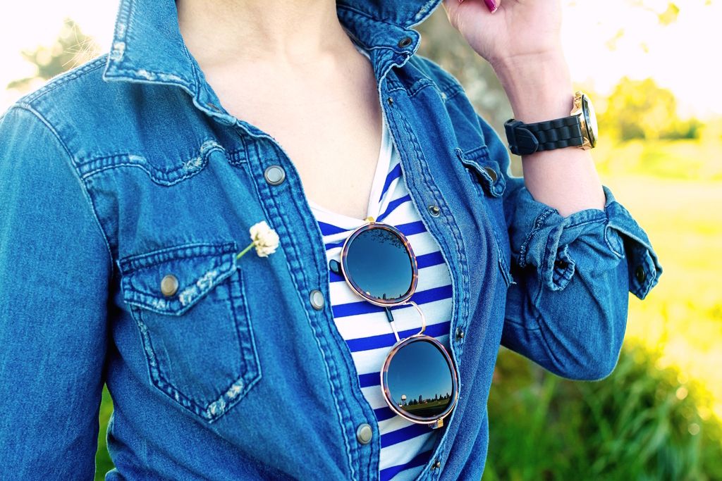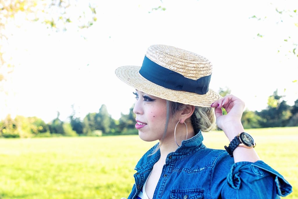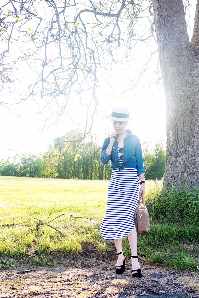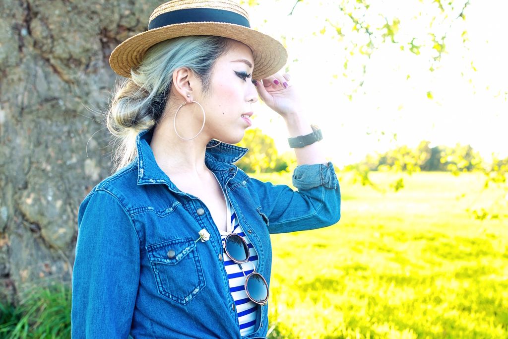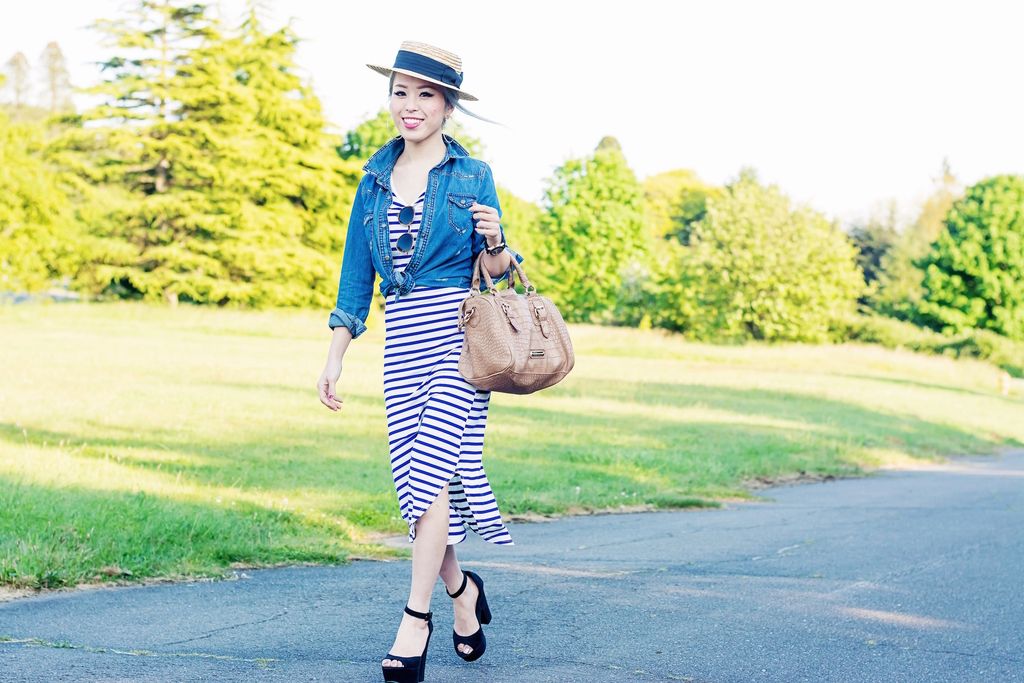 I really appreciate the super lovely weather. It looks like it's already summer, which I love so much! As the temperature gets higher, I get to enjoy wearing more dresses because; 1) it's super comfy and 2) effortless to add a feminine touch. This blue striped casual dress is definitely a fun piece, but I thought it would be cuter if I spiced it up a little bit. So I paired it with a chambray shirt as a jacket, a boater hat for a spring/summer vibe. This hat has been my go-to hat every spring and summer. I still love wearing fedoras and floppy hats, but boater hats seem more like seasonally appropriate pieces that you can easily create a summer-perfect look with. I decided to go for black platform sandals so that the stripe print pops more.Happy Friday dolls!