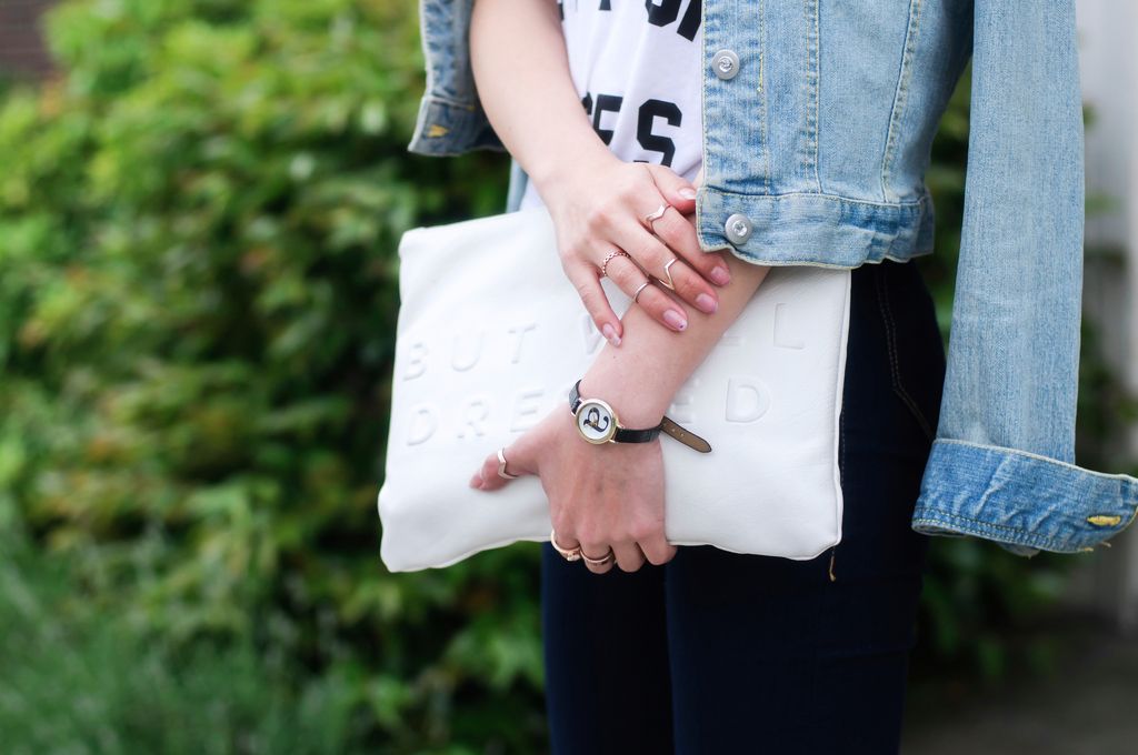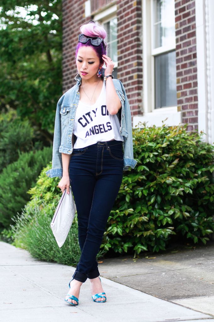 I've been obsessed with a combo of crop tops and high waisted bottoms lately. I used to not like pairing a denim jacket with denim jeans, but I figured that it's one of the great way to look so chic! I kept the look the same hue by adding these blue metallic sandals and my all-time fave white clutch. Although the crop top is a bit casual, having these gorgeous gem earrings around my face help to elevate the look!
